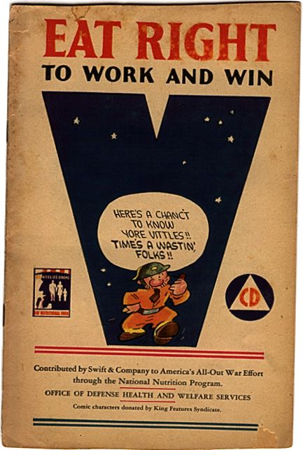 Published during World War II by the Office of Defense Health and Welfare Services. This was a 16 page (8 1/2" x 5 1/2") give-away "contributed by Swift & Company to America's All-Out War Effort." In small print at the bottom of the front page it says: "Comic characters donated by King Features Syndicate." The purpose apparently was to acquaint the public with ways of preparing healthful, economical "victory meals."The Phantom appears in two panels at the top of page 11; he is talking with Diana and there is a smoking frying pan in the background. In the first panel Diana says: "Fried mush and eggs--um-that smells good!" In the second panel the Phantom says: "Sure, Diana, The day always starts right, after a good breakfast of cereal, eggs, bacon, bread---"