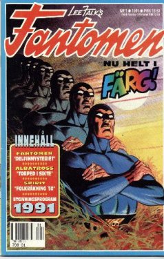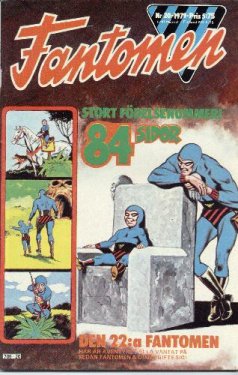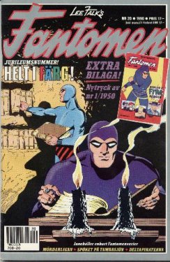 The first issue of Fantomen, with a release date of 5th October 1950 proudly exclaimed "Comics in four colours" on the cover, and was an instant hit. During its first year, with 7 issues published, the magazine sold about 72,000 copies each. The 36 pages in the first issue were shared between The Phantom, Louie (by Harry Hanan), Nancy (by Ernie Bushmiller), Curly Kayoe (by Sam Leff) and Hopalong Cassidy. For the first eight years of Fantomen, daily strip stories were published in strict chronological order, serialised across several consecutive issues. It may seem odd that a magazine entitled Fantomen only had 12 pages of the Phantom, but it was mainly for two reasons. Firstly, Fantomen was based on the European tradition of comic magazines (such as Spirou, Pilote and Asterix from France) which feature a multitude of comic characters. The second reason, believe it or not, was due to the Swedish Post Office! Comic magazines were of course distributed via mail to subscribers, but according to Post Office regulations one "article" (in this case a comic story) was not allowed to take up more than half of the interior pages. This effectively limited Phantom stories to a maximum of 12 pages, and the Phantom stories had to be published in serialised form. These Post Office regulations were in effect up until the 1980s, which is why half of the magazine has always contained other comics. For a brief period in 1959-1960 the magazine was even called Fantomen med Hopalong Cassidy (The Phantom with Hopalong Cassidy). Today it would be almost impossible to change the magazine into an "all-Phantom" magazine, since the readers have come to expect a variety of the world's best comics in the magazine. Because of this, The Phantom himself was a rare guest on the cover for the first decade. Characters from the other comics in the magazine and famous sports stars of the time were more often on the cover.