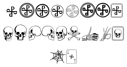 The Phantom-related fonts reside on the following keys: ! 1 2 3 4 5 6 7 8 9 0 A B C D E F G H W. You will need to use a font size of at least 100 point to be able to make them out clearly. They're TrueType so you can resize to your heart's desire -- try 300 point! They may not look that great on your screen, but I assure you that you'll be more than happy with the printed versions. The fonts are mainly different sorts of Good Marks, some skulls and even the spider-web design used for the Sengh pirates in the movie (see below).