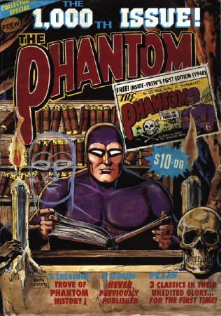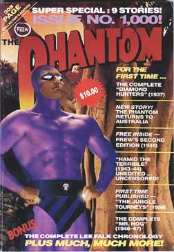 Frew is now well into the new golden era. A period which was celebrated with the release of Frew's 1000th Phantom comic in January 1991 -- a 292 page MONSTER of a comic book which included a bonus replica edition of Frew's first Phantom comic, and a pull-out colour poster illustrated by Sy Barry and George Oleson. Although this issue was numbered #972, it was the 1000th actually produced. This is because #330 was never published, and there were a total of 29 special issues either unnumbered or designated as an "A" issue. So #972 plus 29 minus 1 leaves 1000 -- the 1000th issue actually printed and published. To eliminate further confusion in future publications, Frew dispensed with the use of the A-series for special issues. As from the 1000th edition, the issue numbers continued in strict numerical order.