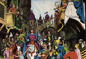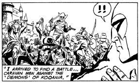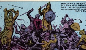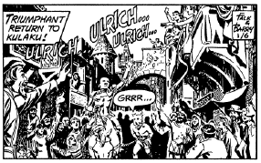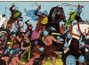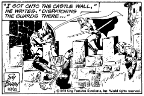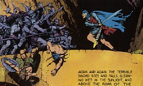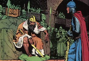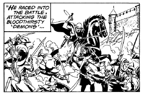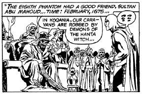 "When I was working with Phil Davis doing layouts very early in the game, we had a Sunday page which had some rearing horses. Now these are illustrative artists and they use photo references and whole files of other artists' material. When I indicated a rifle or a gun or a tank, he had a model or something to copy from. They didn't copy it -- they used the file to get something for a model and they sketched from it. They didn't trace it or anything like that. They had to have a model just like they'd have a model for a woman. At that very moment, in I think it was Flash Gordon, they had some rearing horses. We used that as inspiration, but we didn't copy it. About a year later I moved to New York, and I went up and I had dinner with Alex Raymond up in Stamford where I'd moved to in Connecticut and he was showing me through his studio in his beautiful house and there on his drawing board was the Flash Gordon he was working on and next to it was the Sunday page of Mandrake with the rearing horses -- he was using it as a model. I said, 'But Alex, we copied that from you!' He said "Oh, for Christ's sake!' He'd forgotten."It is perhaps not too surprising to find that Sy Barry and his team of assistants also borrowed from the masters. In particular, it appears they had a certain affinity for Hal Foster's work on Prince Valiant . One such example, from Queen Karola of Kula-Ku (D150) was recently discovered by a Scandinavian reader whose letter was published in Fantomet Nr.23 1997. Since then, Dietmar and I have uncovered many more Prince Valiant panels that were the basis for subsequent panels in The Phantom. In particular, the 1979 Sunday story The Name featured no less than FIVE such panels! Scans of these Phantom panels and their Prince Valiant source are shown below.