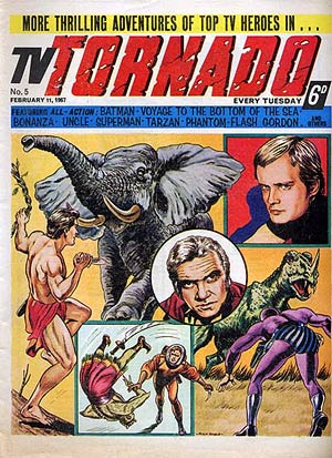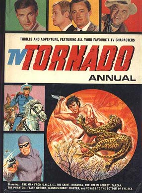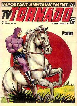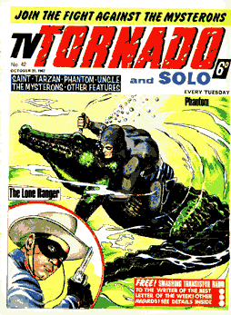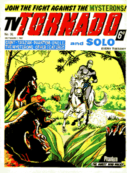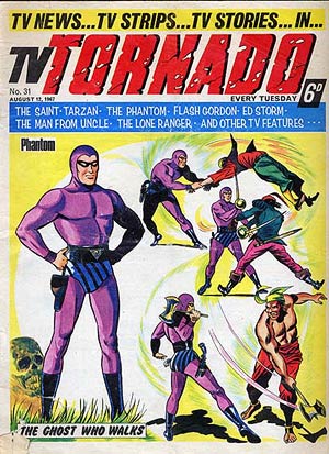 In addition to their Phantom Comic Albums, World Adventure Library, and Phantom Annuals, World Distributors also produced a large format weekly tabloid comic called TV Tornado. Each issue measured 300mm x 230mm (11 3/4" x 9"), ran for 20 pages, and sold for sevenpence. There were 88 comics in total with The Phantom appearing on only a few pages in each issue, alongside many other comic and TV characters. The Phantom was on the cover of many issues, but rarely as the main or solo feature. Five of the Phantom feature covers appear above, along with one of the early covers. Two hardcover TV Tornado Annuals were also produced, one in 1967/68 and the other in 1969/70.
