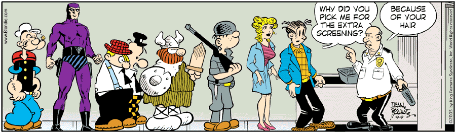 Anybody out there like the famous Blondie strip syndicated by King Features? Blondie is now celebrating its 75th anniversary in comics and to mark the occasion, a large number of King Features characters have been worked into both the daily and Sunday strips. In case you missed it, see if you can somehow track down the September 9 daily strip. You will spot, of all people, The Phantom in that one, along with Popeye, Hagar the Horrible and Beetle Bailey! Aren't comics just wonderful?